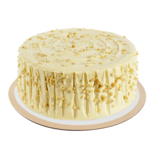 Delectable meringue layers with buttery cream frosting topped with toasted cashew nuts.