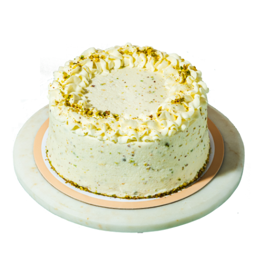 Honeybon’s Pistachio Nougat Cake has multiple layers of subtly sweet and crispy-on-the-outside-and-chewy-inside meringue with nougat and crushed pistachios in between two layers of classic vanilla chiffon cake. The cake is then covered with vanilla whipped cream dotter with crushed pistachios. The entire cake is then crowned with even more crushed pistachios for a delightful finish.