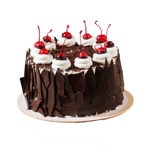 Rich chocolate cake, creamy layers, and a burst of cherries, covered with decadent chocolate shavings.